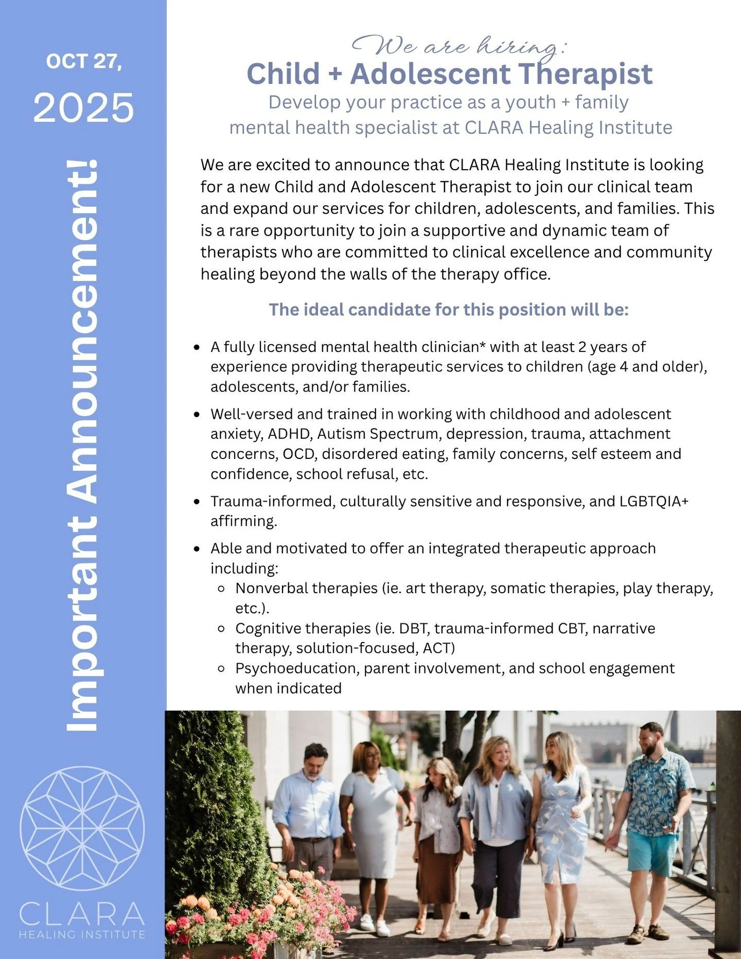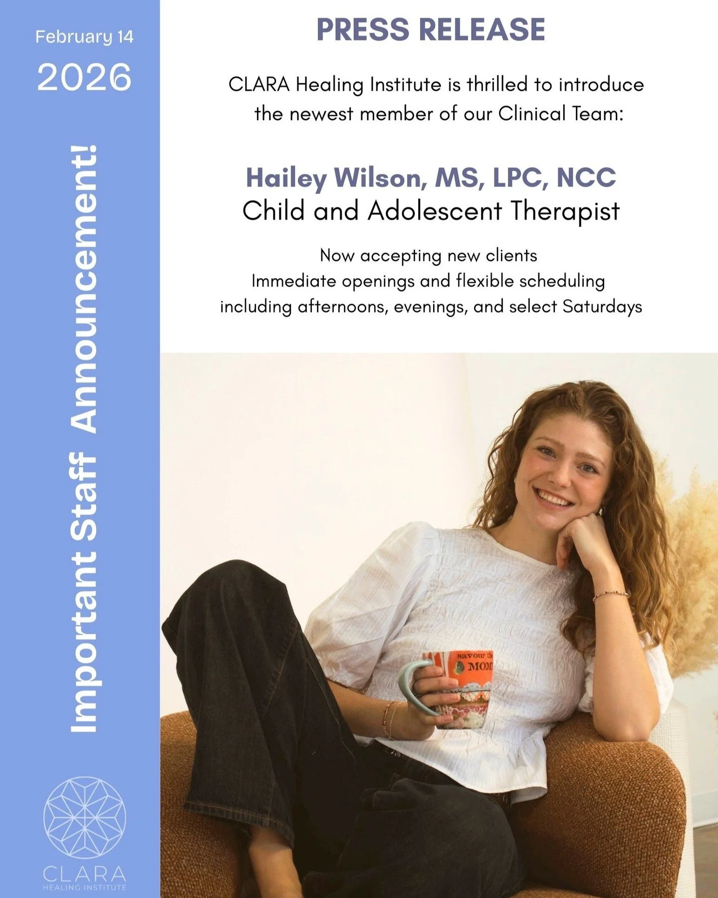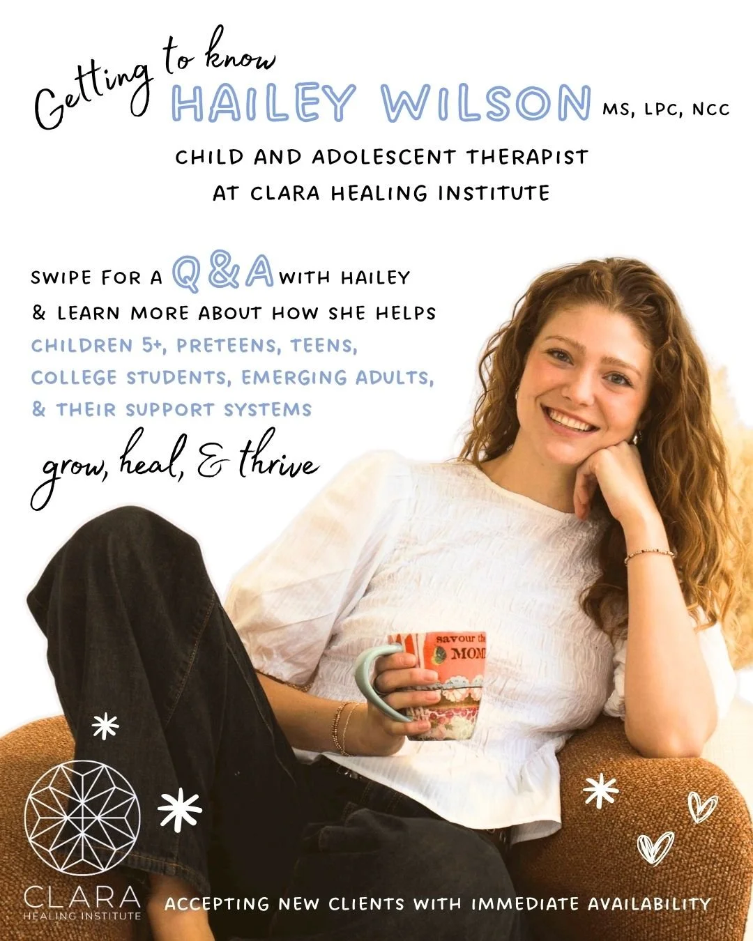 We believe in the mind-body connection, the practice of self care, and we are lifelong learners. We are so thrilled to serve you and witness your growth and healing as you learn about yourself, your relationships, and your family here at CLARA Healing Institute.